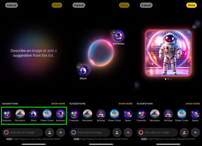 下面是 Image Playground 使用預設指令「Disco」及「Astronaut」生成的圖片範例: