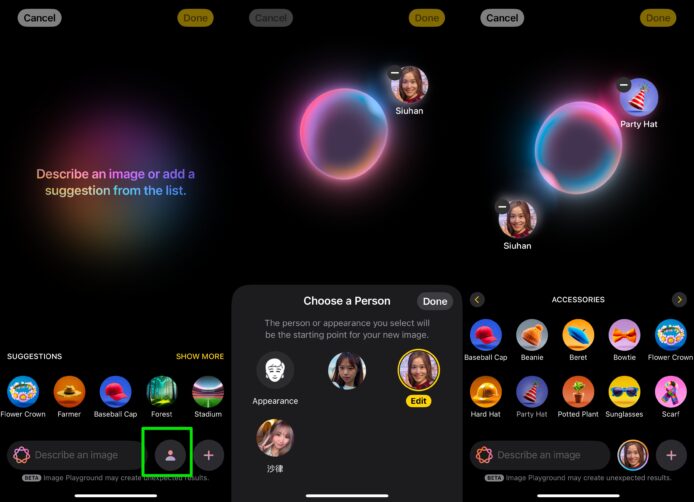 ▲在綠框選擇不同指令,稍等片刻便可看見 Image Playground 生成的圖片