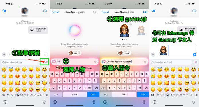 iOS 18.2 正式加入了 Genmoji 功能,讓用家自行組合不同 emoji,甚至是用自己的樣子生成 Emoji。要使用這個功能非常簡單,首先開啟 iMessage,然後轉為 Emoji 鍵盤,點擊鍵盤右上角的按鍵(下圖綠框示),之後選擇你想用誰人的樣子生成 Emoji,然後輸入指令,最後選擇你喜歡的版本即可。