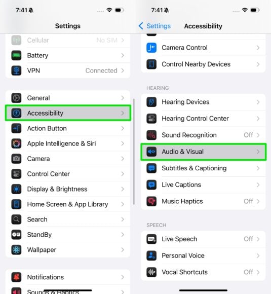 先開啟「Setting」,點擊「Accessibility」,滑動至「Hearing」選擇「Audio & Visual」