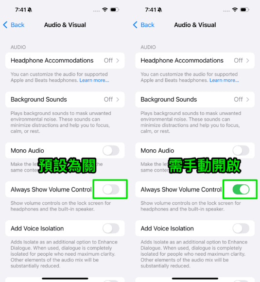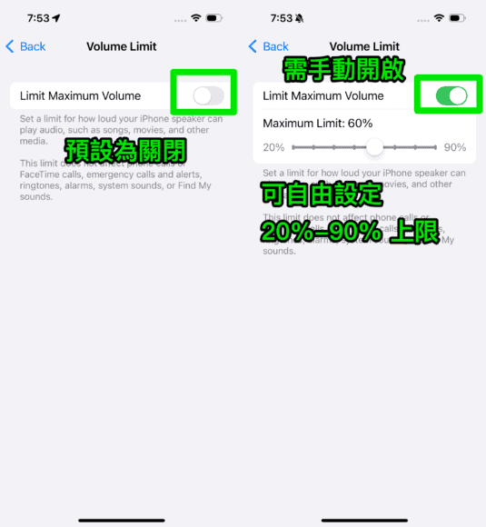 此功能預設為關閉,需要用家手動開啟,然後就可以自由設定 20%-90% 音量上限。不用擔心設定音量上限後會錯過電話、通知,因為這個設定期不會影響電話、FaceTime 通話、緊急電話、警報、鈴聲、鬧鐘、系統聲音及「FindMy」的聲音。
