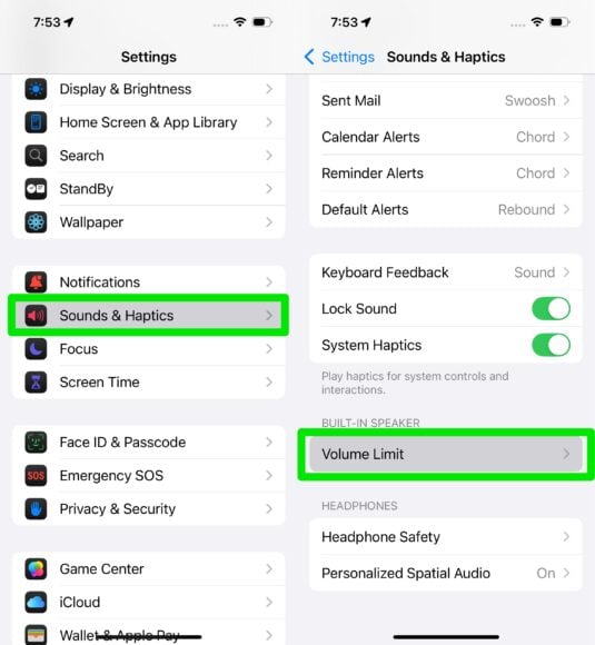 開啟 Setting,點擊Sounds&Haptic,進入設定頁面後選擇 Volume Limit。
