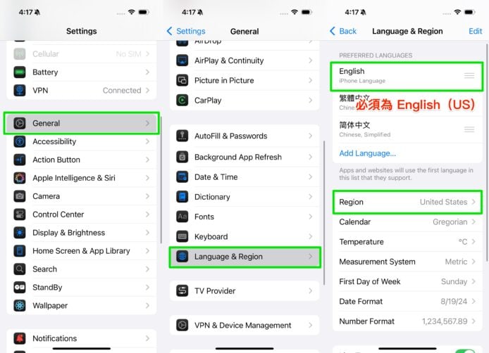 接下來我們要更改電話的語言、地區及 Siri 語言,以符合使用 Apple Intelligence 的要求。首先開啟「設定」,點擊一般(General),選擇語言與地區(Language & Region),將偏好的語言(Preferred Languages)改為 English(US),地區(Region)改為 United States。