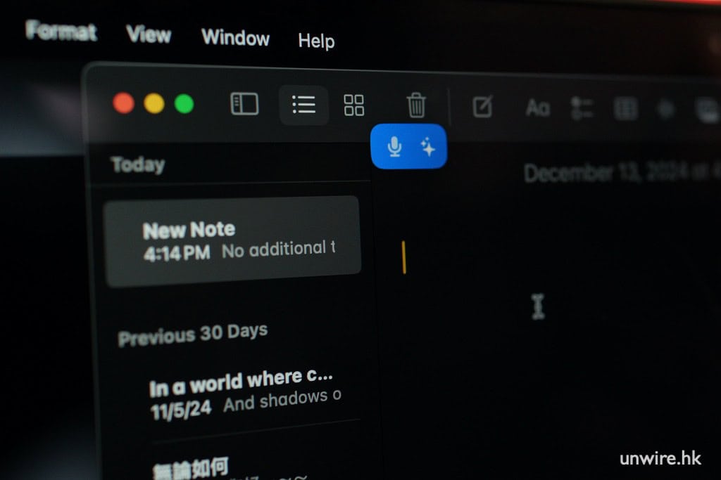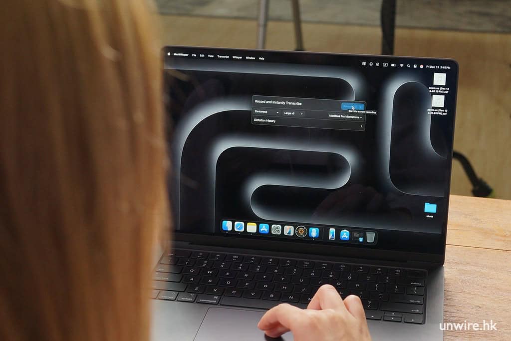 MacWhisper 具有電腦咪高鋒即時錄音,並即時轉換文字的功能。程式放置了一個圖示在畫面右上方的系統選單列。點擊按鈕,設定好 AI 模型按「Record」就可開始錄音,錄音完成後,收音的文字會轉錄成為文字。