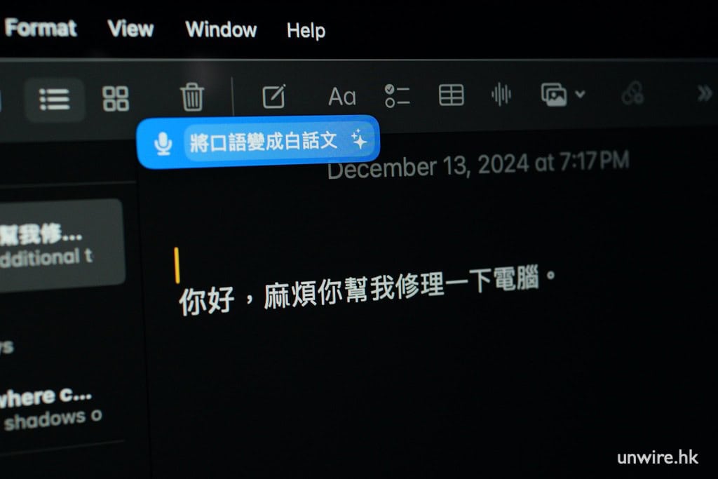 語音輸入更可結合 AI 處理。在程式選單中,輸入你想 AI 為你做的事,例如筆者輸入了「將口語轉換成白話文」,並將之設定成 Active Prompt。然後我在語音輸入後,小編向著咪高鋒說出「你好,唔該你幫我整返好部電腦」,AI 處理後便會將我的說話變成了白話文輸入到文字欄。