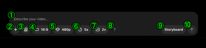 ① 為指令輸入欄,Sora 會根據你輸入的指令生成影片;② 則是上傳按鍵,你可以上傳圖片、影片或從資料庫選擇檔案;③ 則可以選擇 Sora 內置的濾鏡(Preset),按個人需求讓 Sora 替你生成不同風格的影片;④ 是選擇生成影片比例,目前 Sora 可生成 16:9、1:1 及 9:16 的影片;⑤ 就是影片的解像度,Plus 用家可以選擇 480p 或 720p,Pro 用家則多了 1080p 選項;⑥ 則可設定影片長度,Plus 用家可選擇 5 或 10 秒,Pro 用家則可生成最長 20 秒的影片;⑦可選擇每次輸入一個指令後生成多少條影片,Plus 用家使用同一指令一次最多可生成 2 條影片,而 Pro 用家最多一次可生成 4 條影片;在輸入完所有指令後可以在 ⑧ 看看這個指令配合上面的設定需要使用多少個 token 生成;⑨ 可開啟分鏡模式,安排鏡頭調動,最後 ⑩ 就是確認鍵,確保設定無誤,並在 ⑧ 檢查過 Token 使用數量合理之後就可以點擊 ⑩ 讓 Sora 替你生成影片。