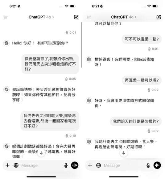 小編假設 GPT-4o 是我女友,並提出明天和她到尖沙咀約會。實際使用時 GPT-4o 對答如流,而且雖然偶有鄉音問題,但比起第一代來說已經改得七七八八,是可以流暢溝通的程度。對話中 GPT-4o 女友能夠回憶剛才對話,又會表揚小編的計劃非常溫馨。
