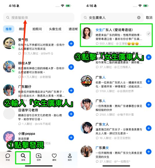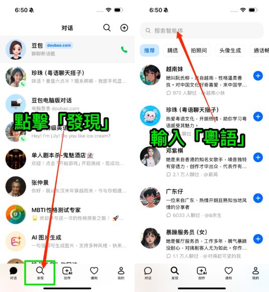 豆包平台上不是每一個 AI 都懂得講廣東話,就算懂廣東話也不一定支援語音功能,所以你要搜尋支援廣東話語音的 AI。下載完畢,開啟應用程式後點擊下面「發現」,在「搜尋智能體」輸入「粵語」。