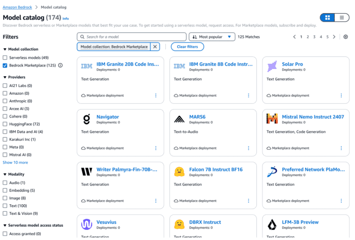 想像一下,現在的 Amazon Bedrock 就像是一個巨大的 AI 模型百貨公司,一次整合了超過 100 種各具特色的基礎模型。從文字處理到影像生成,從專業醫療到金融分析,各種專業範疇的模型應有盡有: