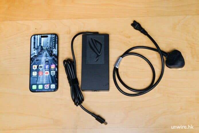 ▲電腦跟來的變壓器比同類型電腦細得多,只有約一部 iPhone Pro Max 的大小