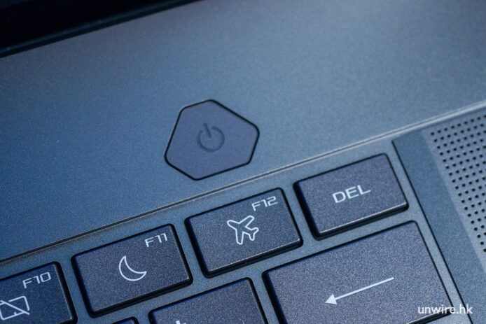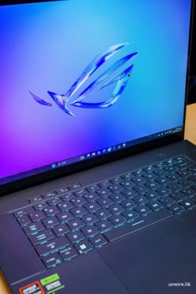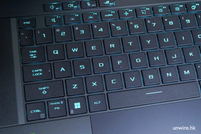 鍵盤的部份也合符遊戲玩家以至辦公用家的工作需要,鍵帽尺寸增大 12% 之外,即使在這麼薄的機身這部 GA605W 也配置了 RGB 背光燈設計。右上角配備玻璃材質電源鍵,開機那一刻開始已感受到貼身的操作感。