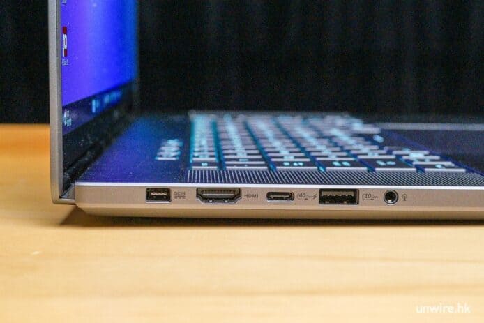 Zephyrus G16 左側配備 DC-IN 電源插口、HDMI 2.1、USB 4 (Thunderbolt 4)、USB 3.2 Gen 2 Type-A 和 3.5mm 耳機孔。