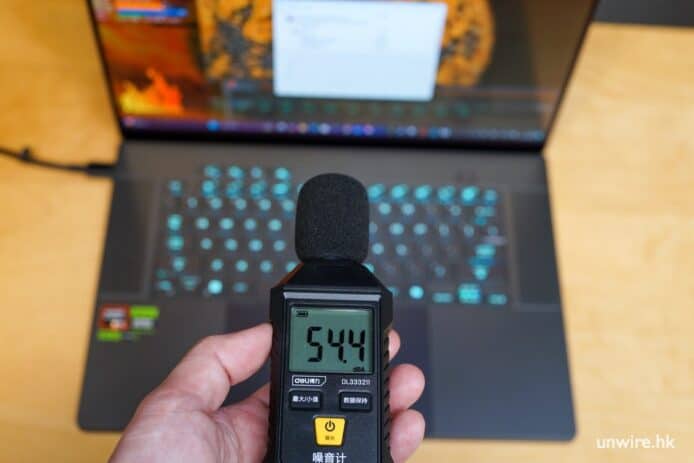 ▲而在一間底噪為 45dB 的房間中,電腦全速運作時噪音也只升到約 58dB,可說是不太嘈吵的音量,在電競手提電腦來說表現相當不錯