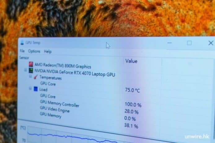 ▲在電腦全速運行下,GPU 晶片溫度為 75 度,屬於正常水平