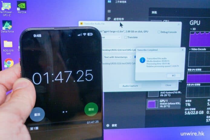 而搭載了 RTX 4070 流動版顯示晶片的 Zephyrus G16,處理用到顯示晶片的 AI 應用都同樣出色。就以 Whisper 聲音轉錄文字工具來說,我們將一段幾分鐘的影片錄音輸入,在 2 分鐘以內就可輸出了影片的中文轉錄文字。