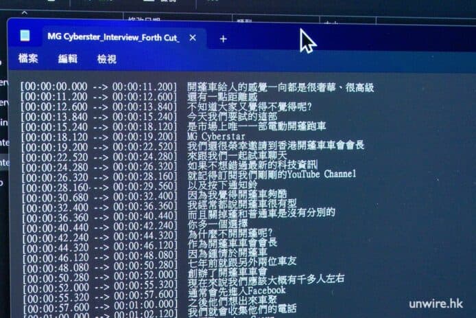 ▲我們運用 AI 工具 Whisper 來處理影片的聲音檔案,在 2 分鐘以內可完成 7 分鐘影片的廣東話語音轉錄文字