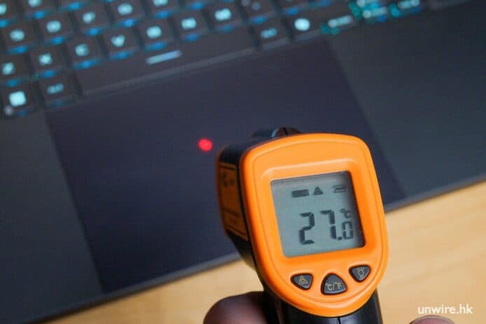 ▲在電腦全速運作之下,我們錄得鍵盤與手托、觸控板位置的溫度分別只有 32 度與 27 度,工作遊戲都無問題