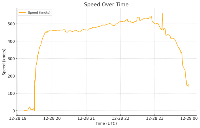 通常在降落時,飛機的速度會逐步減慢,但數據顯示這架飛機在降落前速度忽快忽慢。在接近跑道的時候,速度突然減慢,然後又短暫加速