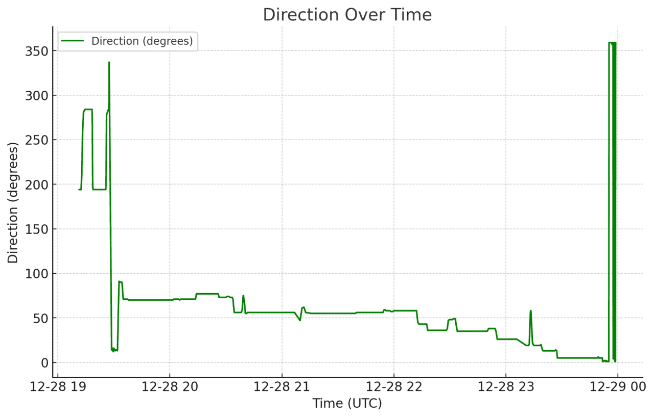 在接近跑道時,飛機的方向(航向)發生了多次快速變化,每次偏移的角度高達 20 至 30 度,這表示飛行員可能正在嘗試修正降落的路徑或找到更安全的角度