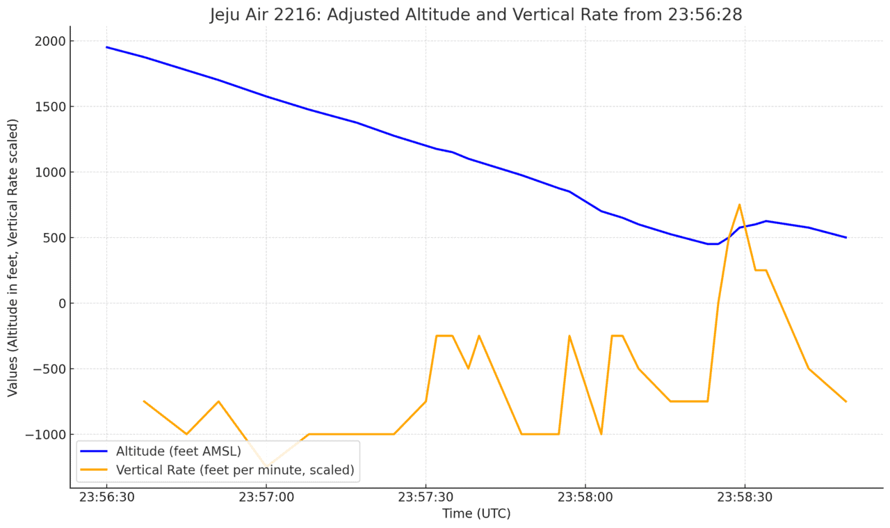 根據數據顯示,飛機最後一次傳回的自動廣播監測系統(ADS-B)訊號時間為協調世界時 23:58:50,當時飛機的位置位於 34.95966, 126.38426,距離務安機場跑道 1 僅 500 英尺高度。根據目視證據(來自相關影片)以及 Flightradar24 的高度與垂直速率數據分析,最後的 ADS-B 訊號可能反映飛行員正在進行一次「flypast」操作。這種操作通常用於確認起落架是否已正常展開,然後再決定後續的降落步驟。每架現代飛機都有一個名為自動廣播監測系統(ADS-B)的設備,它像是飛機的「GPS信標」 。