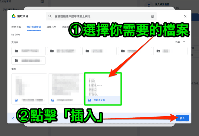 ▲選擇你需要的檔案後點擊「插入」