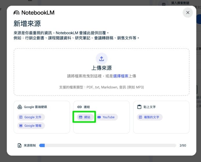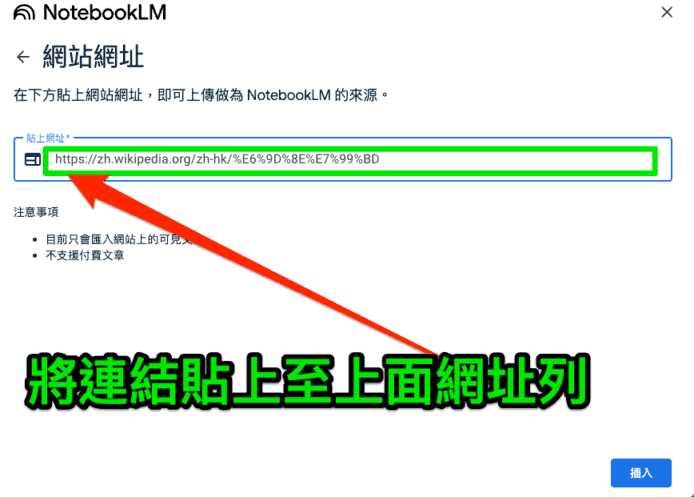 接下來小編會將一條有關李白生平的 Wikipedia 連結分享予 Google NotebookLM。首先選擇「網站」,然後將連結貼上至指定欄目。如果你要分享影片,步驟也是大同小異,你需要點擊旁邊的 YouTube 即可。
