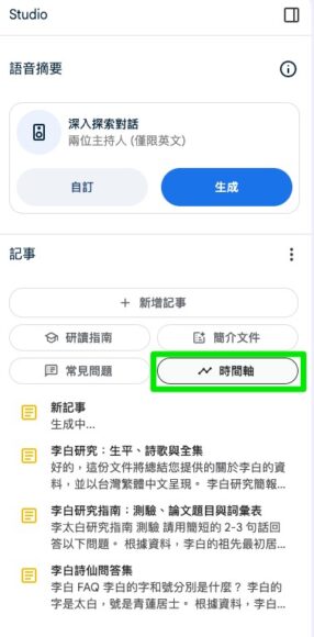 點擊「常見問題」後,NotebookLM 會整合資料,然後提供如李白的生平、核心思想、作品特色等。