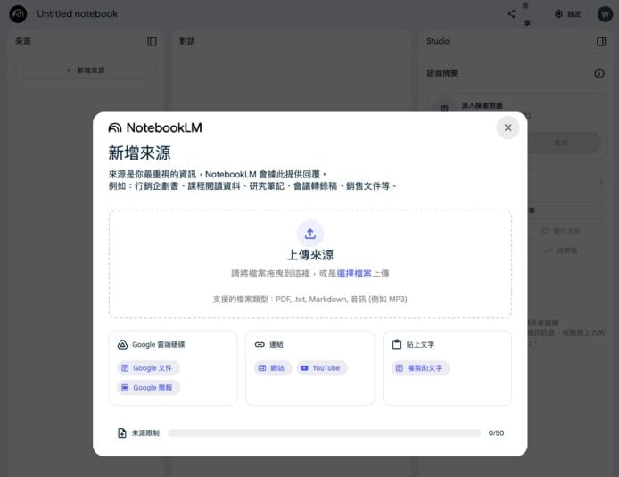 ▲NotebookLM 支援多種檔案格式,可使用各種上傳方式
