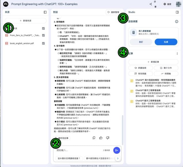 ③更可將內容生成 Podcast,④亦可即時在旁邊建立筆記