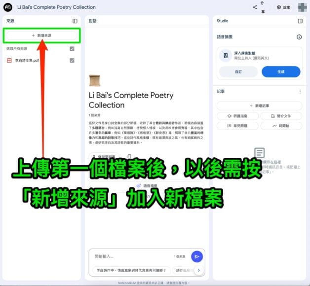 小編就先示範將《李白詩全集》PDF 檔案上傳至 NotebookLM。開啟你所需的檔案,將其拖曳至「上傳來源」虛線格仔後鬆手即可。