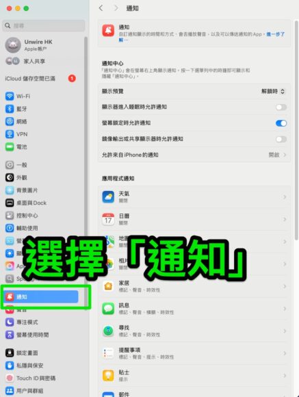 要從 Mac 停止顯示通知功能步驟非常簡單,首先開啟系統設定,選擇通知,然後停止允許來自 iPhone 的通知即可。