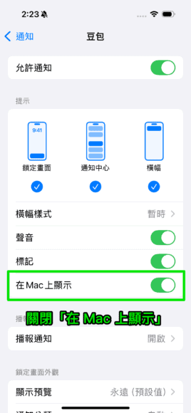 ▲關閉「在 Mac 上顯示」