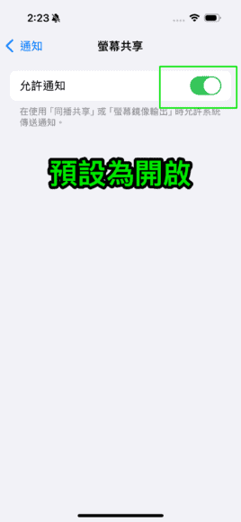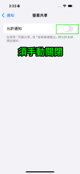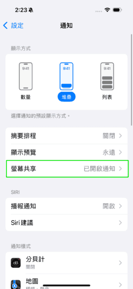 進入設定畫面後,你會看見「螢幕共享」功能顯示為「已開啟通知」,點擊此選項並關閉。