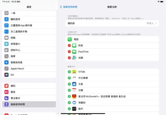始終允許:這些預先設定好的應用程式在任何情況下都可使用,簡單說就是加入了白名單。此外,在 iphone 上用家亦無法禁用「電話」應用程式,但可限制聯絡人。