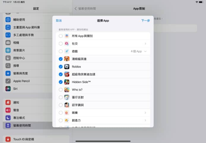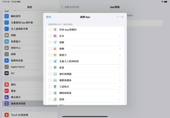 App 限制:為特定應用程式或類別(例如社交媒體類或遊戲類)設定使用時間限制。家長可以指定某類應用,例如遊戲、娛樂,所有相關 App 在設定後都不能使用。