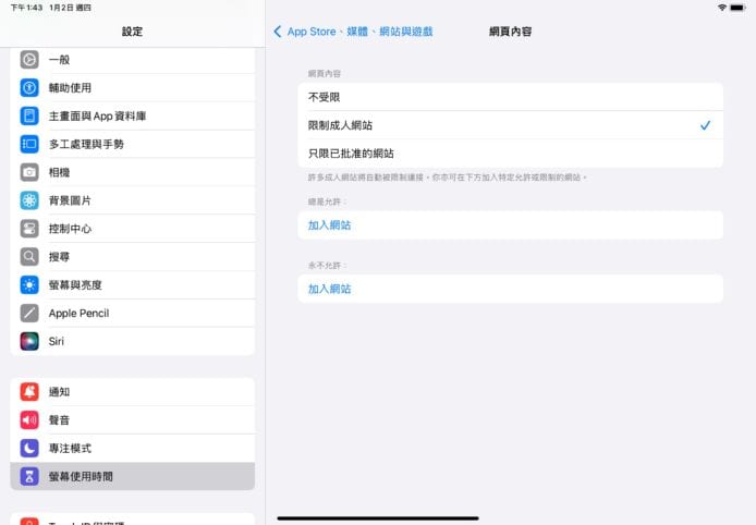 有時小朋友即使在約定時間內玩 ipad,也有可能因為可能好奇而不小心接觸到暴力、色情之類的不雅或成人內容。如果想避免以上情況出現,父母們也可以利用以下的方法,直接根據內容去限制網絡上的成人內容。在「內容和私隱限制」中,點選「App Store、媒體、網絡和遊戲」。根據需要,為各項功能設定適當的限制。在此家長還可以限制網絡上的成人內容,並可進一步將特定網站添加至允許或阻止列表,或僅允許訪問經批准的網站例如學校網頁、google classroom 等等。