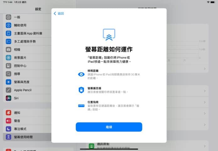 新增屏幕距離:確保小朋友在合適的距離(不少於 30cm)觀看屏幕,若果太近系統會作出提示,小朋友要移動至合適距離再按下「繼續」才可使用,此功能需要同時使用 Face ID。