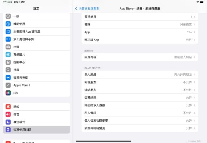 然後,家長可以為孩子設定 iPhone 或 iPad 在那些內容可用,自訂他們的分級保護控制,例如:限制網頁內容、APP 的適合年齡類別、電影電視的等級、媒體、書籍是否適合兒童等,設定好之後系統便會自動限制不適合的內容。