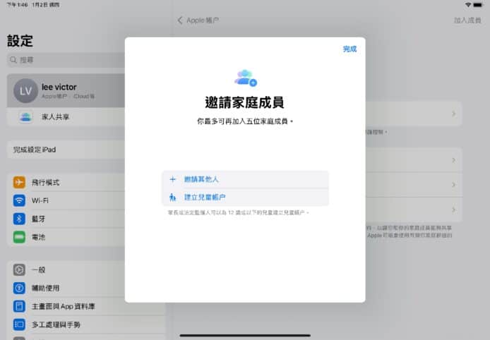 首先,在設定頁面的「家人共享」選擇「加入成員」,為孩子設定「兒童帳戶」,最多可以加入 4 位家庭成員。然後,輸入兒童的名字、出生日期、再輸入電郵地址及密碼等資料。