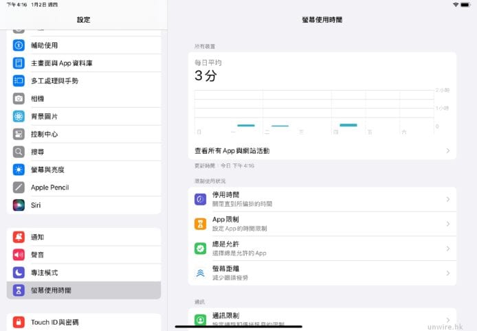 在「設定」中,點選「熒幕使用時間」,便可以在介面中看到以下的設定:
