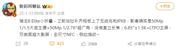 其他規格方面,包括採用 Qualcomm Snapdragon 8 Elite 處理器、6.85 吋 1.5K 解析度 LTPO 摺疊式主熒幕及維持設有雙曲面超大機面副熒幕,亦支援 NFC 功能及側鍵指紋辨識設計。未知如果這個配置屬實,大家又有沒有興趣升級或入手呢?歡迎大家一齊討論一下。