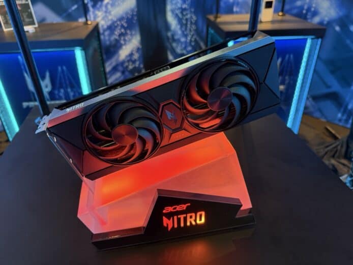 同場亦展出了 Acer Nitro Intel Arc B580 系列顯示卡,期望能為高效能遊戲玩家和創作者提供強勁的圖像處理能力。新顯示咭使用 Xe2 全新架構,效能比 4060 高上 10% 但價格更便宜。兩把 9cm 散熱扇組成 FrostBlade 冷卻系統,運作安靜順暢。