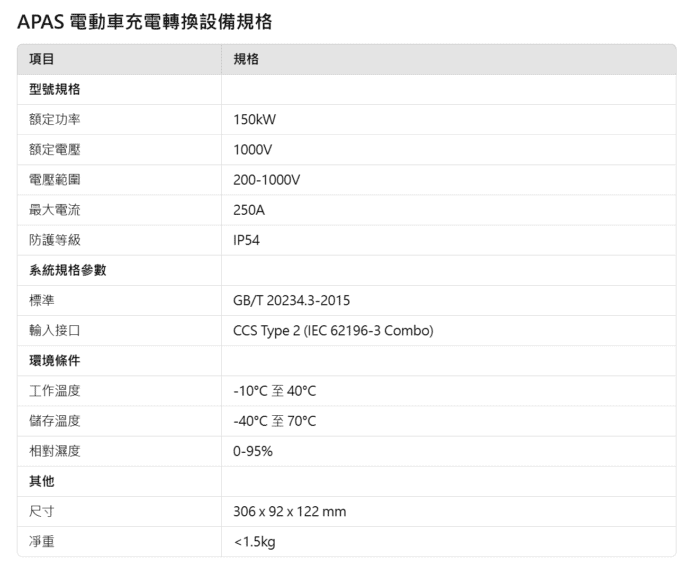 電動車逐漸普及,「港車北上」的主要挑戰之一在於充電標準的差異。香港主要採用歐洲充電標準,而內地則使用國標系統,兩者在插頭設計及協定上不兼容。這導致港車駛入內地後,難以找到合適的充電設施。此外,市場上缺乏標準化的轉換設備,即使存在轉換器,也可能因設備不匹配或性能問題導致安全隱患。APAS 正在測試的充電轉換裝置,分別提供歐/日制式轉換成國標,並可以支援最高 150kW 功率,能滿足現時內地主流的 DC 直流快充設施。