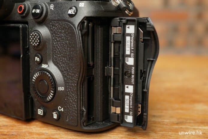 新款相機延續了 Sony 現代化選單系統,上述的 5 個轉盤中有 3 個有鎖定按鍵,在專業攝影師忙碌的拍攝工作中,避免誤操作的出現。機身除轉盤外,亦擁有 Joysick、C1 至到 C4 共 4 個自訂功能按鍵,獨立錄影按鍵等。機身連接性一如旗艦級別,包括咪高風插口、耳機插口、有線網絡插口、PC 同步插口、全尺寸的 HDMI 插口與快速充電功能,應對專業拍攝需求。記憶卡插槽支援雙 CFexpress Type A 與 SD 卡,確保用家自由選擇儲存媒體,適合穩定高速連拍、8K 影片攝錄的需求。
