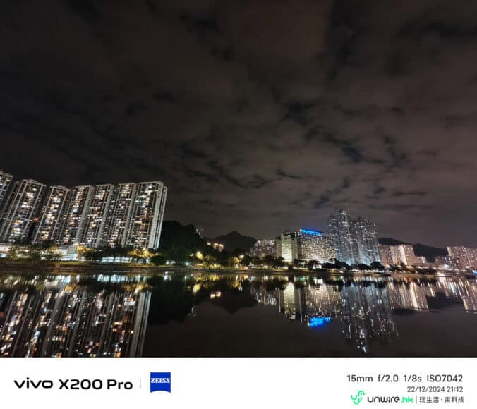 ▲之後筆者再以日間相同焦段,在夜間於香港城門河畔拍攝夜景,大家可以見到各鏡頭即使在低光環境下,拍出來的相片依然十分出色,不過暗位(例如:天上的雲)明顯有出現油畫化情況,相信是因為系統為了磨平雜訊或噪點而出現的情況,不過整體表現仍算十分不錯。