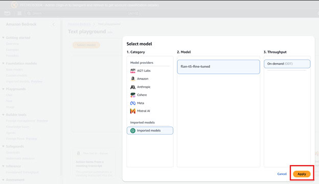 在 Category 選擇 Imported models,選擇 flan-t5-fine-tuned 模型,再選擇 On-demand Throughput。最後選擇 Apply。