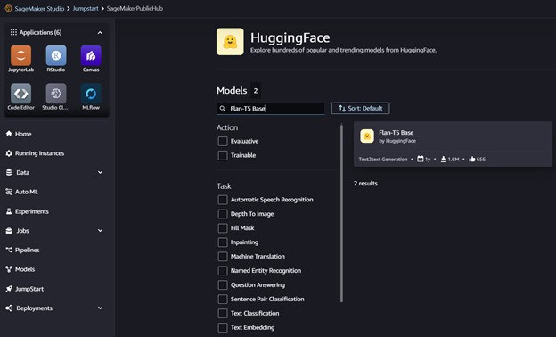 在 SageMaker Studio 中,選擇 JumpStart。搜尋並選擇 Hugging Face Flan-T5 模型。