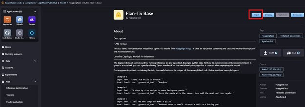 在模型詳細資訊頁面上,可以查看模型的簡述、如何部署模型、微調模型,以及自訂模型所需的訓練數據格式。選擇 Train 以開始根據訓練數據微調模型。