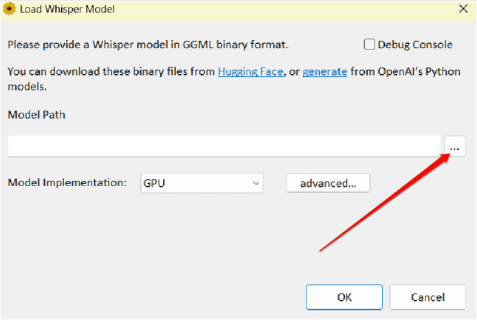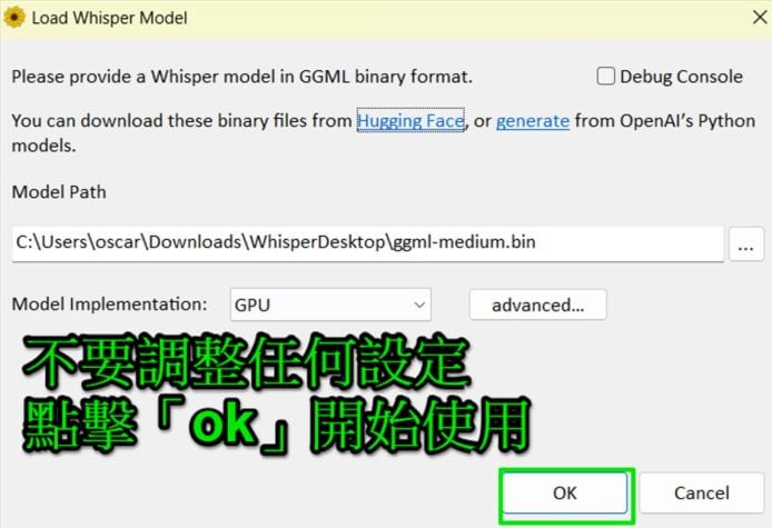 現時回到 WhisperDesktop,檢查 Model Path 是否剛才選擇的 ggml 模型,如正確就不要調整任何設定,保留其他設定為預設值後點擊「ok」