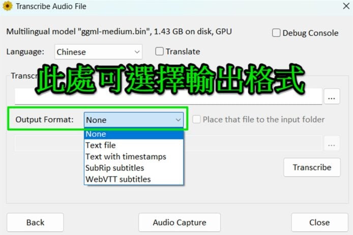 之後你可以在「Output Format」選擇輸出甚麼格式的文字稿:
